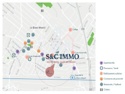 À 5 min à pied : Bus, Maternelle, Élémentaire, Alimentation générale, Restaurant, Médecin généraliste. À 10 min en voiture : Métro, Hôpital. À 15 min à pied : Crèche, Collège. À 5 min en voiture : Tramway.