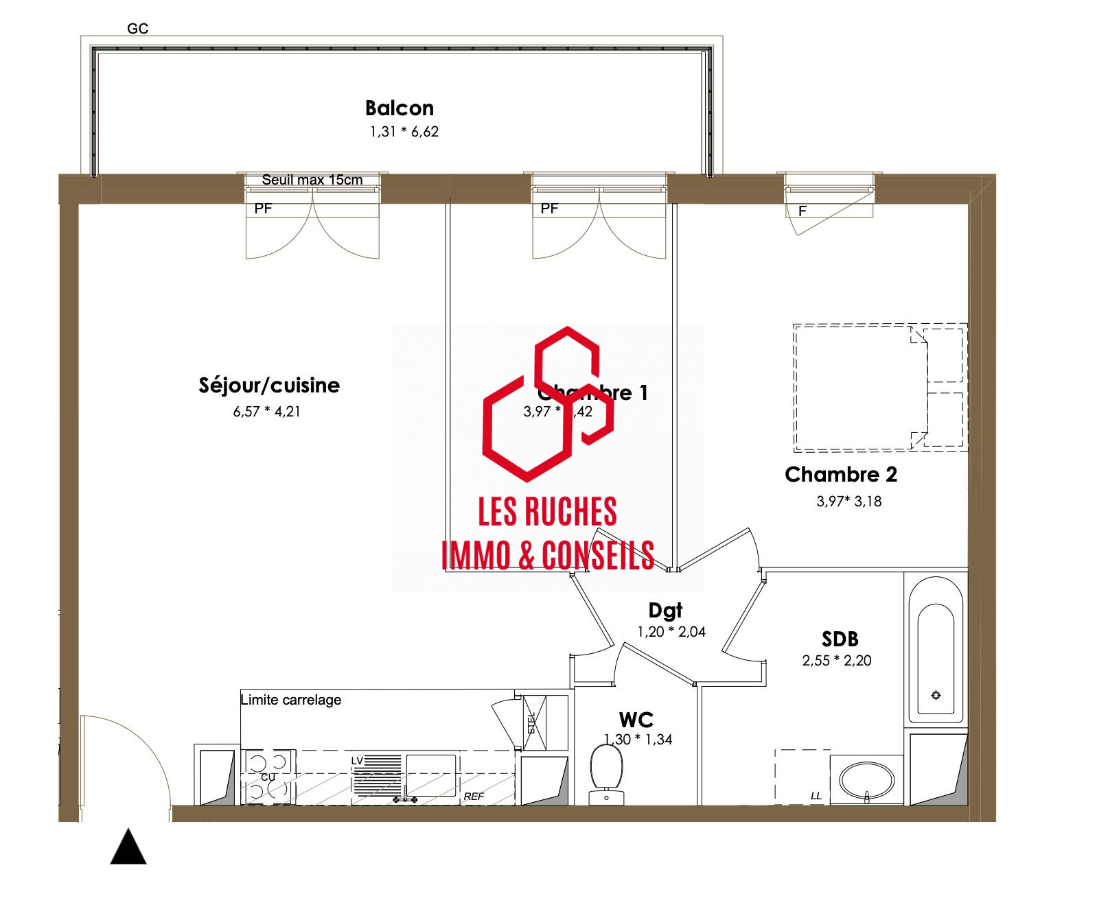 L'entrée dessert un séjour LUMINEUX grâce à son exposition plein SUD, et une cuisine américaine aménagée.