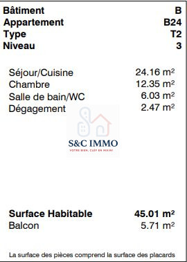 Ne laissez pas passer cette opportunité de vous offrir un appartement T2 lumineux, moderne et fonctionnel, où chaque détail a été pensé pour votre bien-être. Contactez dès maintenant nos conseillers de S&C Immo pour obtenir plus d'informations. Nous serons ravis de vous accompagner dans cette belle aventure immobilière et de vous aider à concrétiser votre projet.