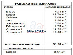 Les deux chambres, dont une suite parentale, offrent un espace de vie intime et confortable. La salle de bain, moderne et élégante, complète parfaitement cet appartement.