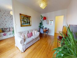 Dès l'entrée, la lumière s'impose. Le séjour profite d'une vue ouverte et d'une belle respiration visuelle, accentuée par la hauteur d'étage et la double orientation qui assure clarté et circulation naturelle de l'air tout au long de la journée. La distribution est équilibrée : Un séjour lumineux, Deux chambres, Un espace indépendant pouvant accueillir une troisième chambre ou un bureau, Une salle de bain avec baignoire, Un WC séparé, Des rangements intégrés optimisant les volumes.