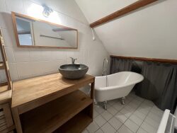 À l'étage, vous trouverez un espace nuit avec dressing, complété par une salle de bains avec WC. Le bien offre un agencement fonctionnel avec une séparation claire entre l'espace jour et l'espace nuit, apportant confort et praticité au quotidien.