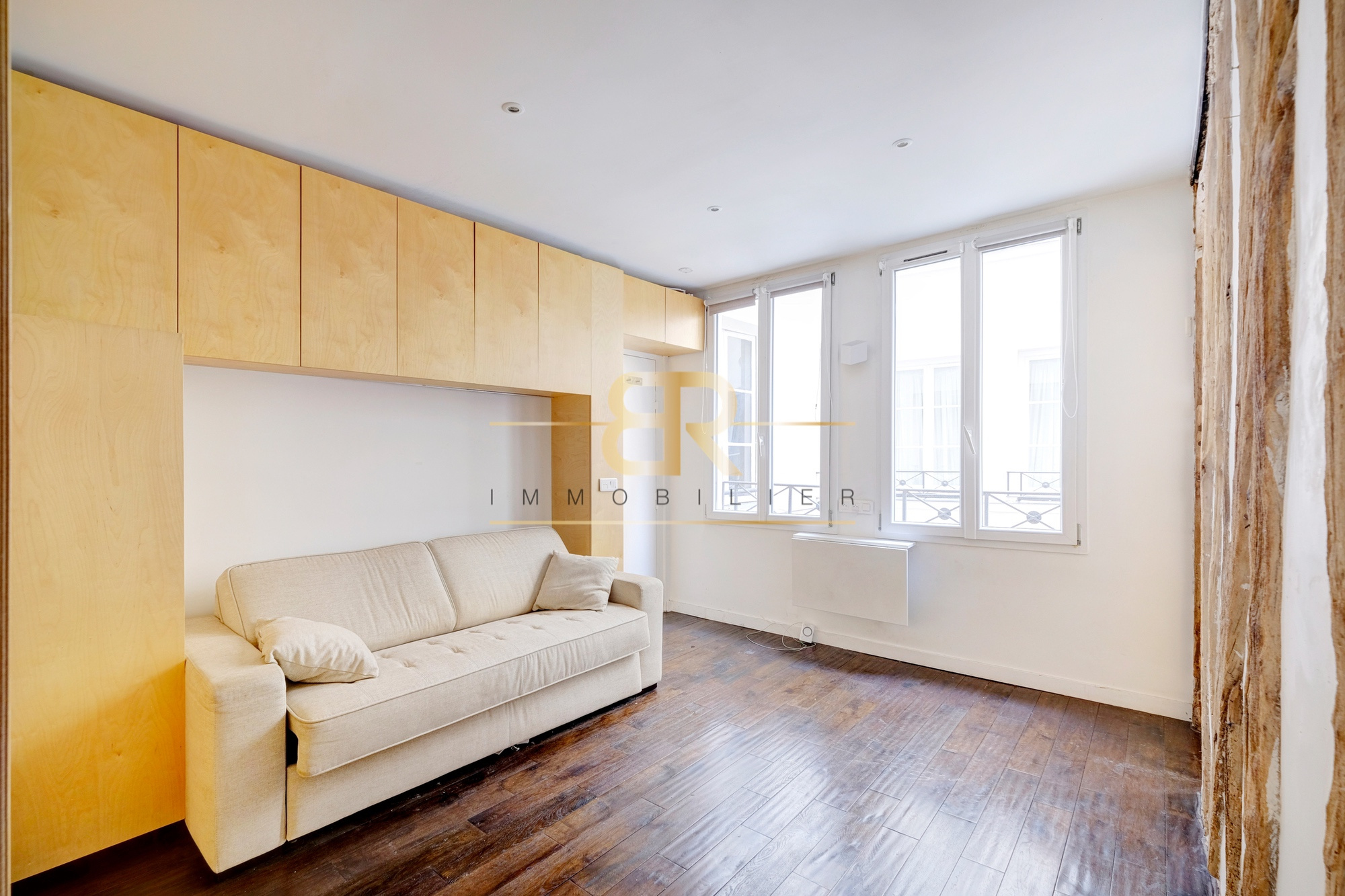 STUDIO d'environ 15 m² sur cour, situé au premier étage d'un immeuble de 1975, comprenant : une entrée principale, une cuisine ouverte et aménagée et une salle de bains avec WC. Fibre optique - Double vitrage - Vidéophone.