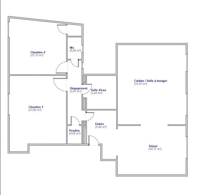 L'appartement se compose d'une entrée desservant un séjour spacieux et lumineux, de deux chambres confortables, d'une cuisine aménagée, d'une salle de bains ainsi que de WC séparés, offrant une distribution fonctionnelle et équilibrée, idéale pour une famille ou un couple en quête d'espace.