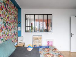 Il comprend une entrée spacieuse et lumineuse avec des rangements, qui donne sur le séjour / salle à manger, agrémenté d'une verrière atelier qui apporte du caractère au lieu et ouvre sur une première chambre. La cuisine indépendante et fonctionnelle, elle donne accès direct à un balcon. Une seconde chambre, une salle de bains et un WC séparé.