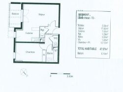Le logement dispose d'un séjour, une cuisine, une chambre, une salle de bains, un WC, un balcon et une place de parking.