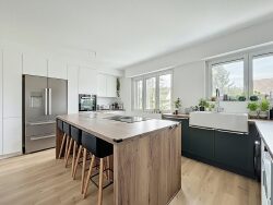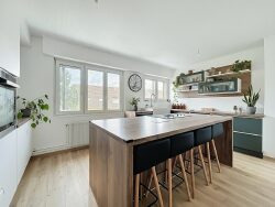 L'entrée dessert un beau séjour lumineux exposé sud, avec accès direct à une grande terrasse, idéale pour profiter des beaux jours. La cuisine séparée, moderne et fonctionnelle, dispose d'un îlot central et de nombreux rangements.