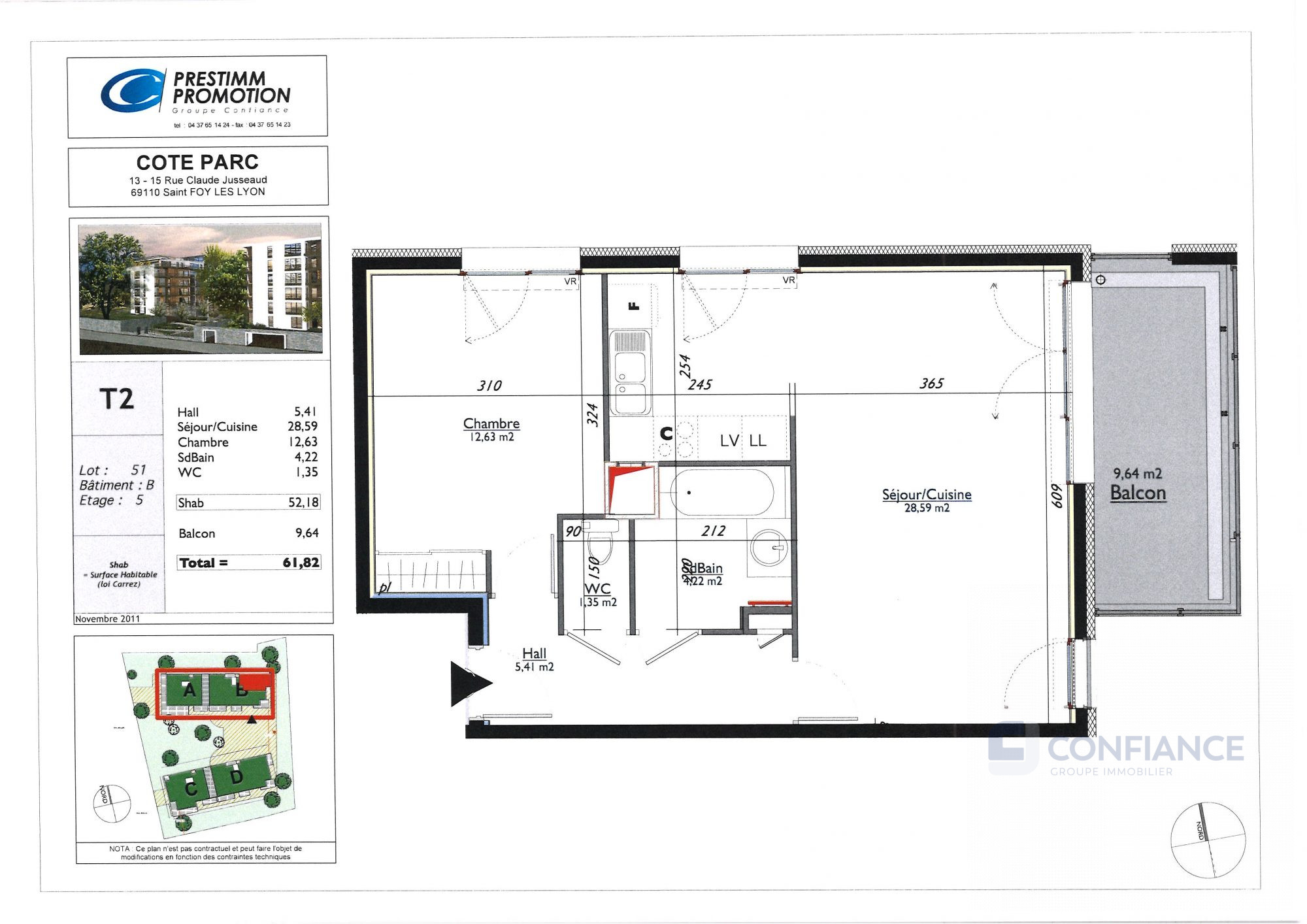 SAINTE FOY LES LYON RARE !!! Dans un ecrin de verdure '15 Rue Claude Jusseaud' très belle résidence récente de 2014. Type 2 de 52m² en dernier étage avec magnifique balcon sur intérieur de copropriété calme et ensolleilé. Grand espace de vie, séjour cuisine ouverte de 28m², grande chambre avec rangement, salle de bain avec baignoire, WC indépendant,local a velo, garage en sous-sol. Vous serez séduit par cette résidence au calme par son architecture ainsi que ses prestations de qualités. Un achat en toute sérénité. Le prix de ce confort 255 000uros, honoraires à la charge du vendeur. Charges annuelle 1476 soit 123 mensuel, (charges courantes, eau froide, eau chaude et chauffage inclus). Bien soumis au régime de la copropriété 79 lots. Pas de procédures en cours. DPE C(108kwh/m2/an) et gaz effet de serre C(21kg co2/m2/an). CONFIANCE IMMOBILER, vous accompagne dans tous vos projets (estimation, vente, défiscalisation immobilière).Dossier suivi par Christophe MOREL agissant sous statut d'agent commercial ADC69012022000002005 , barème d'honoraires (se reporter au site Groupe confiance). Agence transaction 04.37.43.41.31