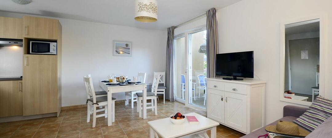 Le logement dispose d'un séjour donnant sur une terrasse, une cuisine, une chambre, une salle de bains, un WC, une place de parking.