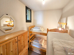Il se compose d'une entrée fonctionnelle, d'un séjour lumineux avec coin cuisine, d'une chambre équipée de 2 lits superposés, d'une salle de bain avec baignoire et de WC séparés. Le séjour ouvre sur un balcon ensoleillé d'environ 3 m²,avec vue montagne à 180°