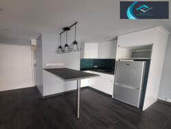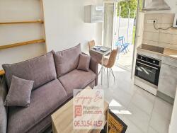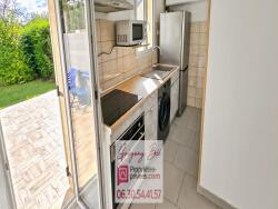 Il est composé d'un séjour, une cuisine équipée d'une plaque de cuisson, une hotte, un four, un réfrigérateur et de la place pour mettre un lave linge (possibilité à la demande d'enlever des éléments), une chambre et une salle d'eau avec WC.