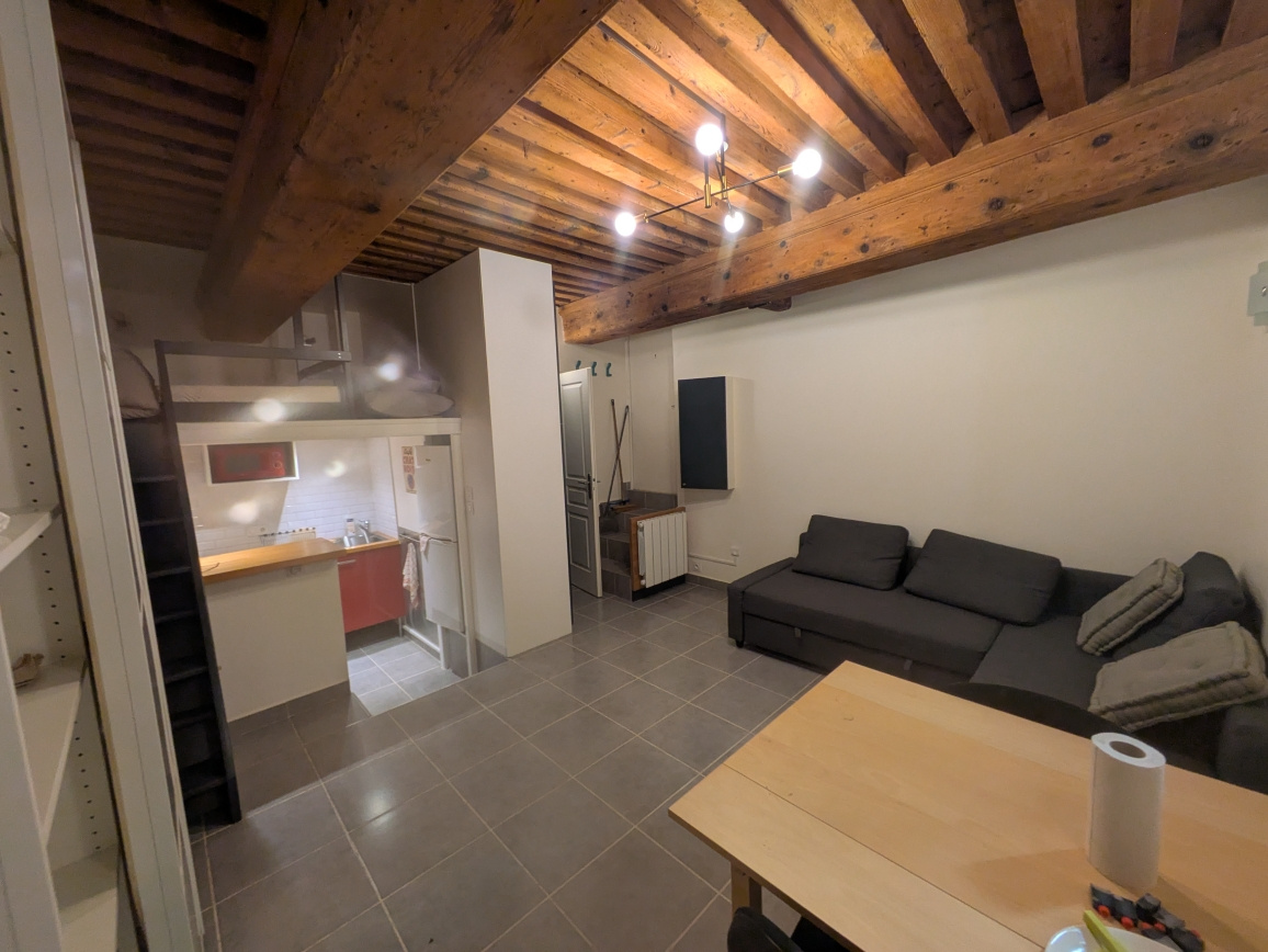 Au 1er étage de l'immeuble (avec ascenseur), l'appartement dispose du caractère typique du canut : poutre en bois, hauteur sous plafond, pierres apparentes. Avec ses 25 m² habitables et ses 35 m² au sol, vous disposerez d'une pièce de vie lumineuse, d'un coin cuisine, d'une salle d'eau avec WC. Côté nuit, l'espace en mezzanine permet d'avoir une chambre isolée.
