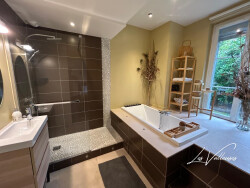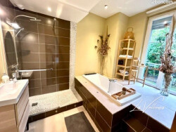 Un grand séjour de 40 M2 environ avec une cuisine ouverte et équipée moderne avec un îlot central et des équipements neufs. Deux spacieuses chambres dans un espace nuit de 35 m2 Salle de bain moderne avec grande baignoire 2 mètres , équipée d'une douche italienne deux places de stationnement privatives face au logement.