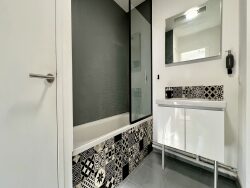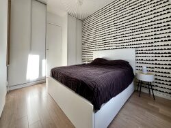 Une grande chambre avec placards pour plus de confort et une salle de bain avec emplacement pour machines à laver et sècher.