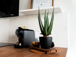 La cuisine américaine sur mesure, entièrement équipée et aménagée, s'intègre avec élégance au séjour, offrant une atmosphère contemporaine et conviviale.