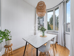 L'appartement est au premier étage de cette petite copropriété, dans un secteur résidentiel recherché au calme, ce bien rare offre un cadre de vie privilégié à proximité immédiate des commodités. Ce bien est en excellent état et a conservé tout le cachet de l'ancien avec son parquet en bois massif d'origine et son esprit art déco, harmonieusement associé à des prestations modernes. La pièce de vie, spacieuse et lumineuse, se prolonge par une salle à manger en rotonde offrant une belle clarté naturelle. La cuisine indépendante est entièrement équipée et aménagée avec des matériaux de qualité. L'espace nuit se compose de deux grandes chambres. La salle de bains récemment rénovée dispose à la fois d'une baignoire et d'une douche.