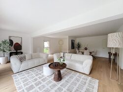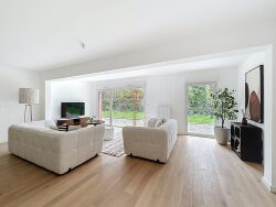 L'entrée s'ouvre sur un couloir spacieux de 9 m², menant à une pièce de vie baignée de lumière de 54 m², où salon, salle à manger et cuisine se prolongent naturellement vers une terrasse généreuse de 60 m² et un jardin privatif de 230 m² exposé sud-ouest, écrin de verdure bercé par le soleil