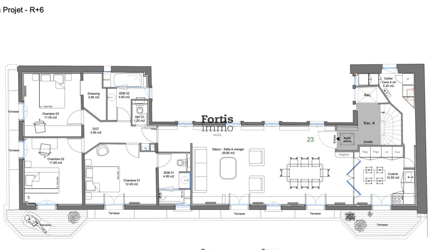 Disposition: Espaces lumineux, séjour spacieux, cuisine américaine équipée, 3 chambres élégantes