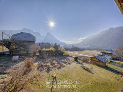 Dans un environnement privilégié, bénéficiant d'une vue panoramique dégagée sur les montagnes et surplombant le village de Dingy-Saint-Clair, ce duplex de 157 m² Carrez environ prend place au sein d'une ancienne bâtisse. Implanté sur un parc arboré d'environ 3 700 m² en copropriété, le bien profite d'un extérieur rare. L'appartement séduit par ses volumes et sa luminosité : triple exposition Est/Sud/Ouest. La pièce de vie chaleureuse avec un poêle à bois s'ouvre sur une cuisine américaine entièrement équipée, créant un espace convivial et fluide. Au même niveau, deux grandes chambres de 26 m² et de 33 m², chacune avec une salle d'eau privative, permettent de faire de belles chambres d'enfants ou d'accueillir des amis. A l'étage, l'espace parental comprend une chambre en soupente pleine de charme et une salle de bain avec poutres apparentes. Un grenier, un cabanon privatif de 12 m² avec une terrasse, un atelier, une buanderie, un local vélos et des stationnements extérieurs, complètent les prestations ce bien. Proche des écoles, des transports et des axes routiers vers Annecy, Thônes et les stations de ski, ce bien s'adresse aux amateurs de nature et d'authenticité. CLASSE ÉNERGIE : D / CLASSE CLIMAT : B Montant moyen estimé des dépenses annuelles pour un usage standard, établi à partir des prix des années 2021, 2022 et 2023: entre 1 320 euros et 1 830 euros. Les informations sur les risques auxquels ce bien est exposé sont disponibles sur le site Géorisques pour les zones concernées : www.georisques.gouv.fr. Contact : Dominique 06 61 75 80 10 Copropriété de 7 lots - dont 3 lots habitation. Charges annuelles : 3750 euros. Dominique MOINE (EI) Agent Commercial - Numéro RSAC : 512 486 259 - ANNECY.