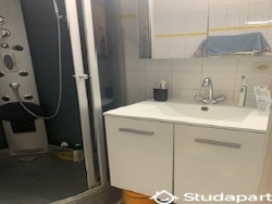 Salle de bain avec douche, lavabo, WC et rangements.