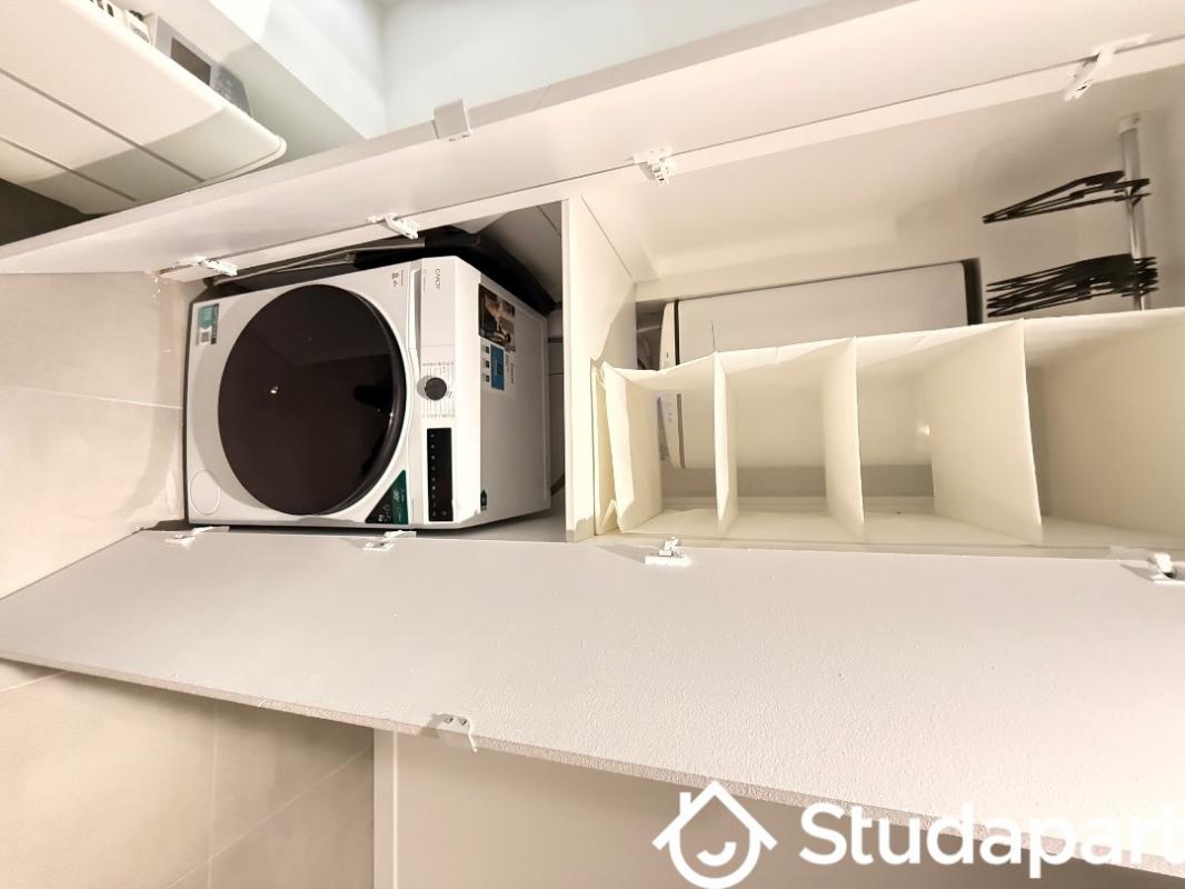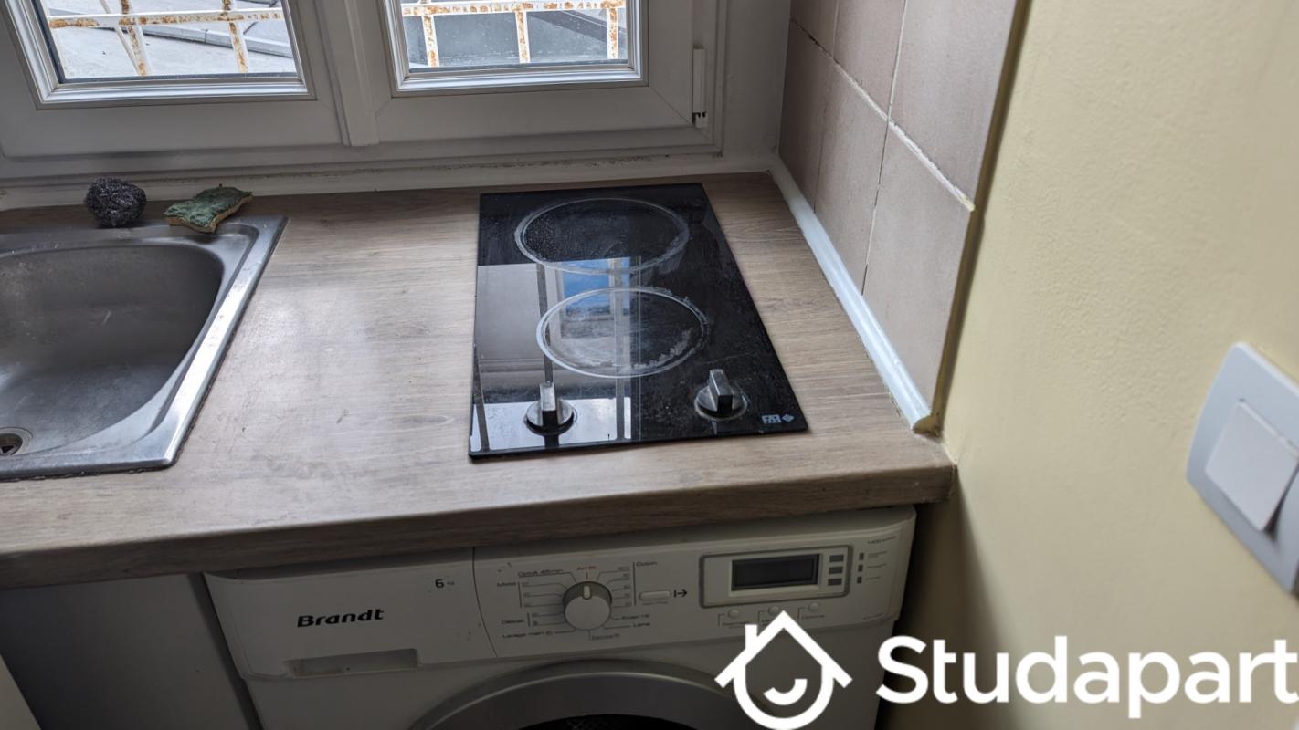 un coin cuisine avec une plaque vitro-céramique 2 foyers, un réfrigérateur avec freezer, un lave-linge, un micro-ondes, un évier, des meubles de rangement, de la vaisselle.