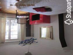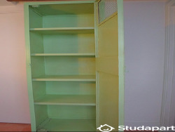 une pièce à vivre avec deux grandes fenêtres, un lit extensible pour former 2 couchages (2 grands tiroirs de rangement sous le lit), une table et chaise, une armoire penderie avec 2 tiroirs, une armoire colonne avec étagères.