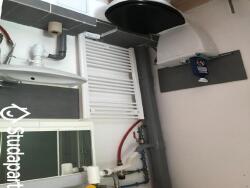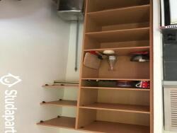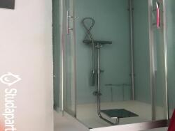 Avec cuisinette, douche et WC, penderie et étagères, un canapé pliant, une table pliante, couette fournie.