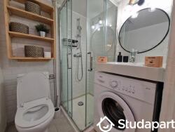 - Salle d'eau : douche, lavabo, machine à lever, sèche serviette, WC.