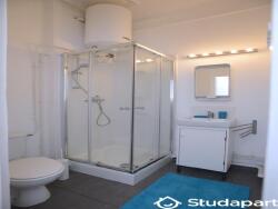 La salle d'eau offre une cabine de douche, une vasque avec meuble de rangement et armoire de toilette, et les WC.