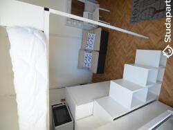 Le lit EN 140, en mezzanine, est accéssible par un escalier.