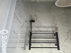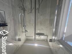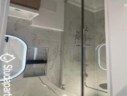 Une salle de bains avec une belle cabine de douche, un sèche serviette, un miroir lumineux, des rangements.