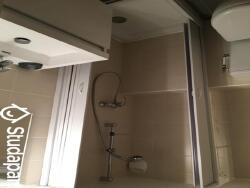 Salle d eau avec toilettes, cabine de douche, meuble sous vasque et miroir.