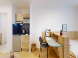 A? l'inte?rieur, la re?sidence se pare d'une de?coration conviviale et chaleureuse avec des espaces partage?s comme une salle de de?tente, un espace cafe?te?ria avec une Epicoop, des salles de coworking, une salle fitness et une laverie connecte?e.