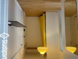 Un studio composé d'une entée avec un rangement toute hauteur, une étagère , suivie de la pièce à vivre, une porte sur la cuisine toute équipée plaque électriques 4 feux hotte aspirante, réfrigérateur et congélateur, lave linge top, des rangements pour la vaisselle, un ballon d'eau chaude , une table repliable , double vitrage sur fenêtre PVC et de la cuisine une porte coulissante sur la douche fermée par une porte vitrée , les WC., un lave mains et son rangement suspendus ,double vitrage et VMC automatique et autonome .