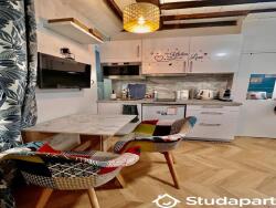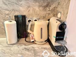 · Une cuisine équipée : réfrigérateur, plaques à induction, grill micro-ondes, bouilloire, machine à café Nespresso, assiettes, bols, couverts, poêles et casseroles sont mis à disposition.