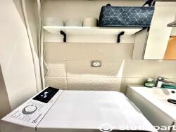 · Une salle de bain avec une grande douche Italienne, lavabo avec des tiroirs, machine lave linge, sèche-cheveux et toilette/WC