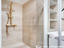 - Une salle de douche avec douche, lavabo et WC.