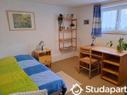 Chambre de 12 m² avec lit de 90, table de nuit, literie neuve, bureau avec tiroirs, connexion éthernet, étagère murale, petit meuble à tiroirs et armoire penderie.