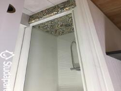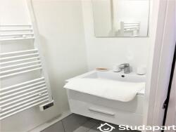 Salle de bain moderne, refaite à neuf avec douche, vasque et rangements,