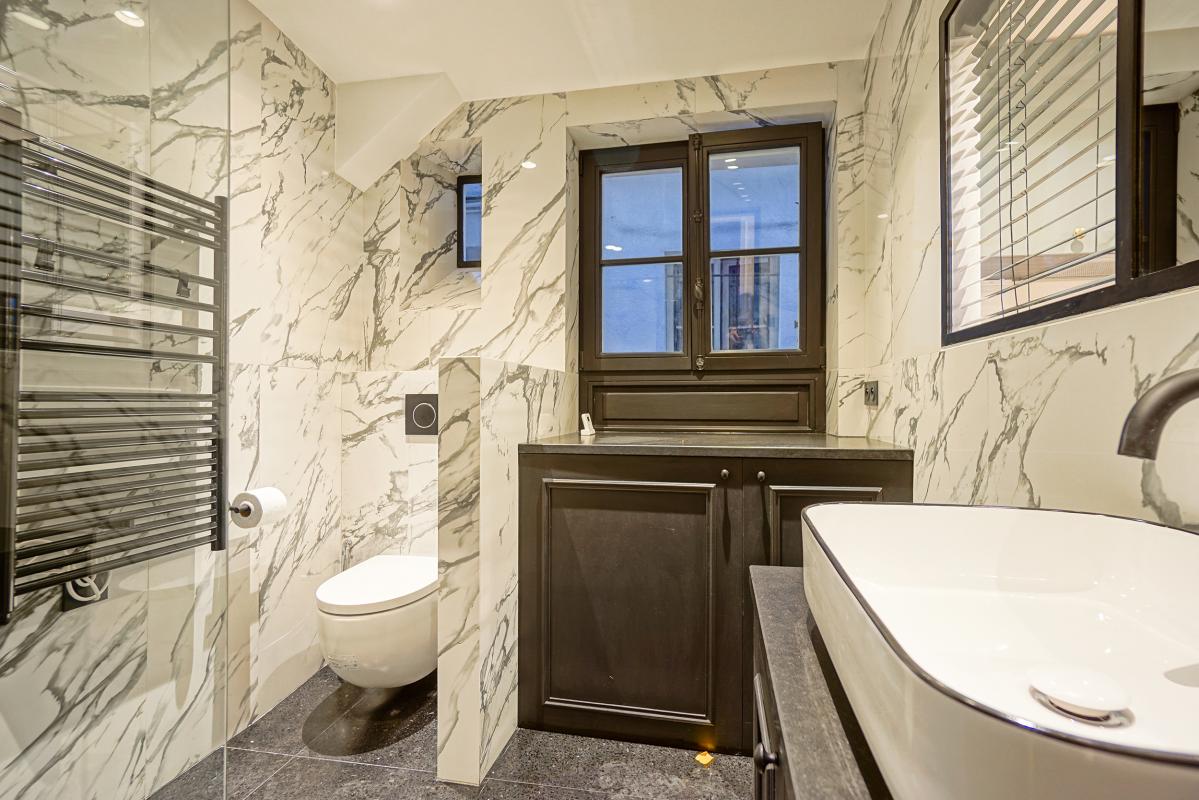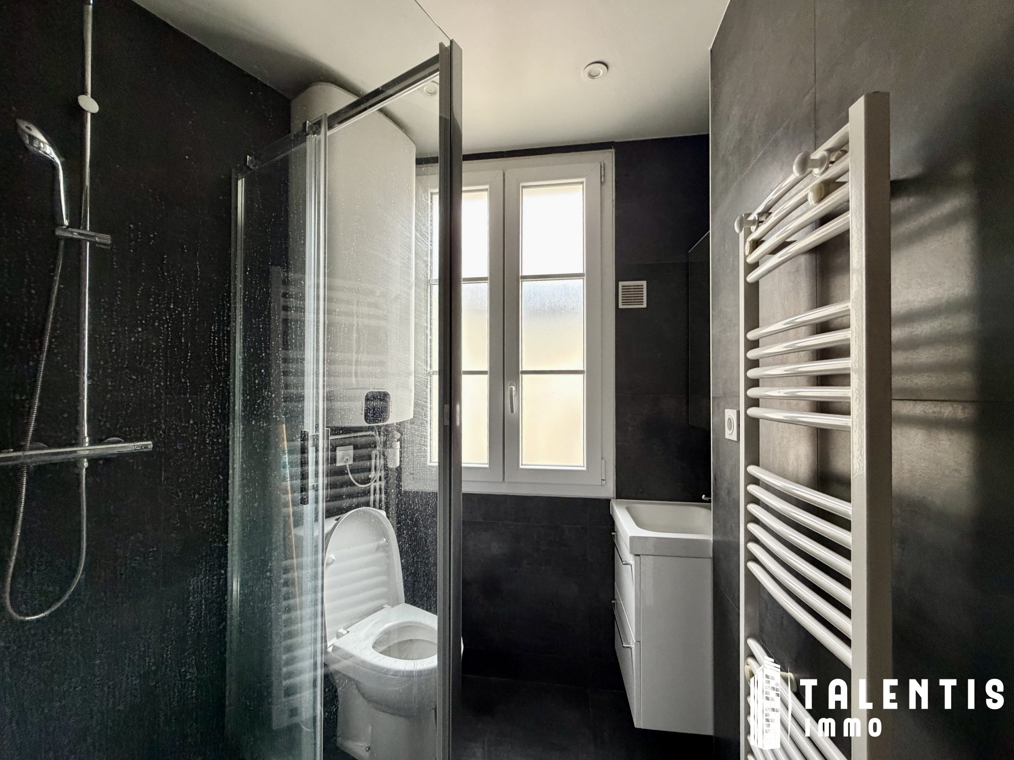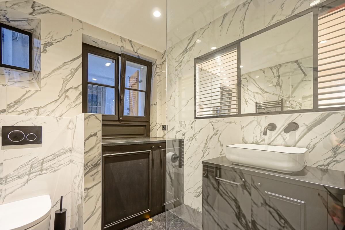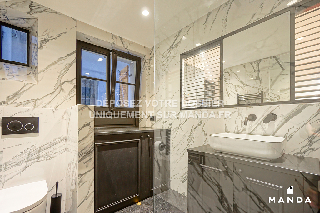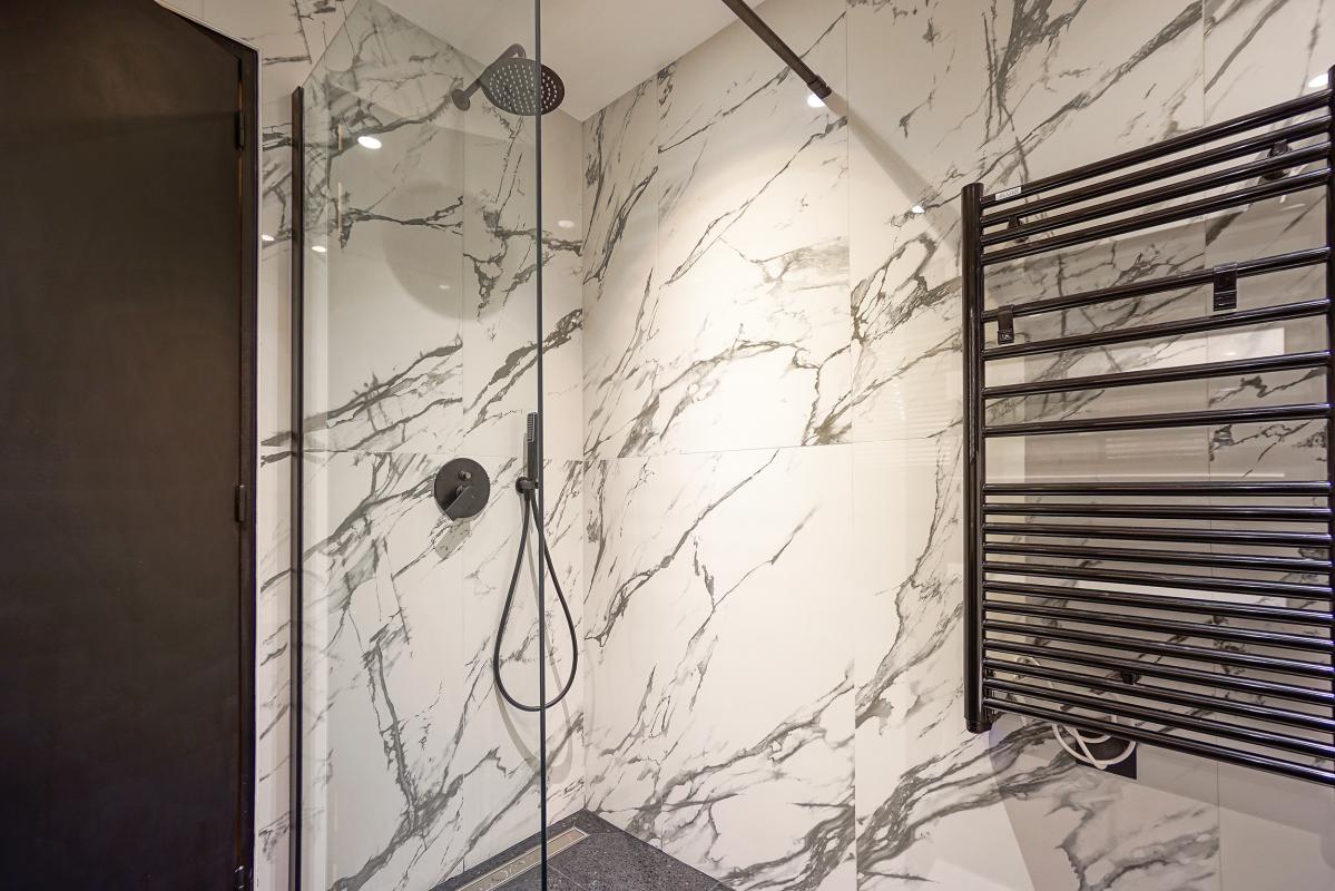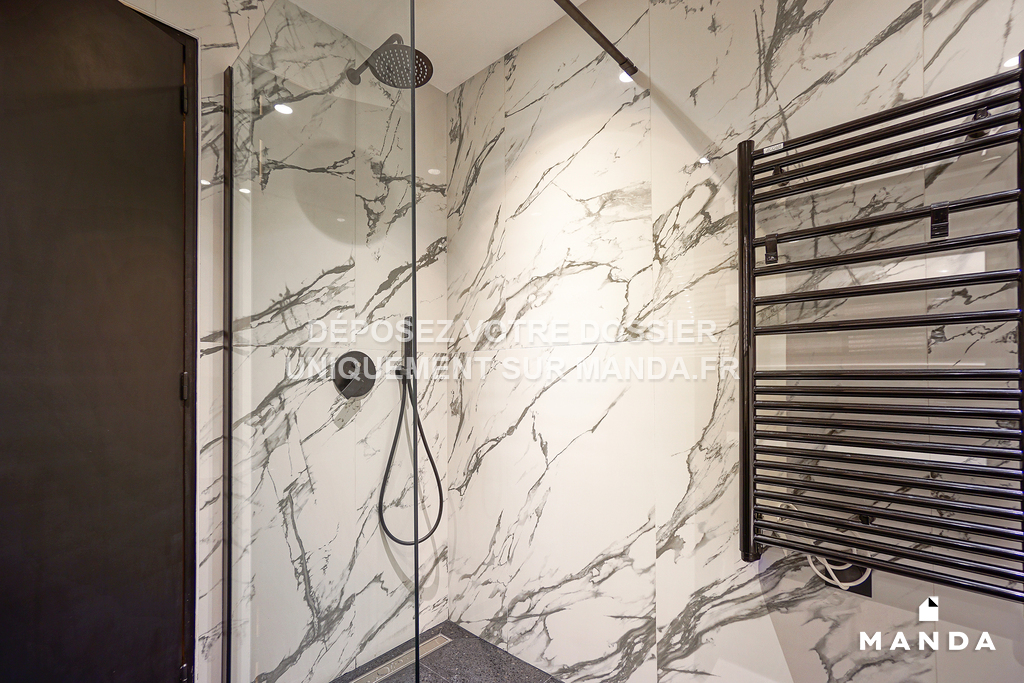 La salle de bain : Spacieuse et moderne, elle comprend une douche à l'italienne, un lavabo avec miroir et des toilettes séparées. Le design est épuré avec des matériaux résistants et faciles à entretenir, parfaits pour un étudiant. Le carrelage est de style contemporain et les installations sont de qualité.