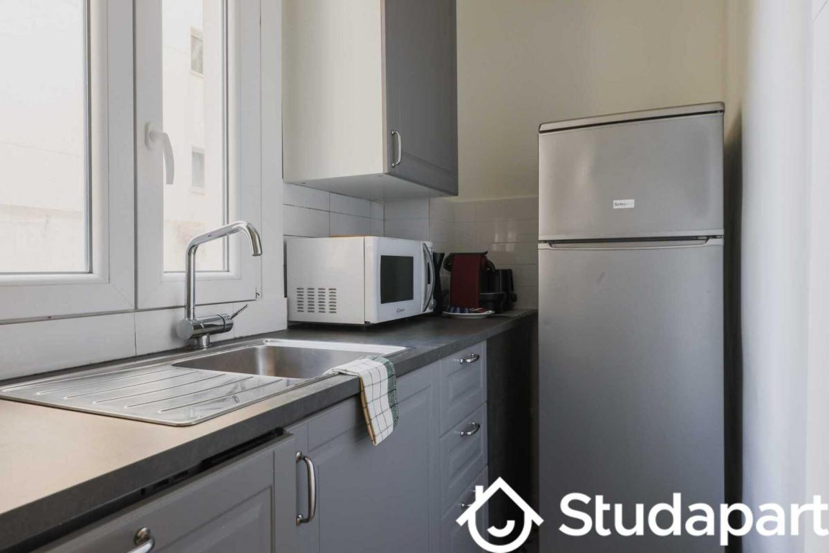 - Une cuisine équipée comprenant un réfrigérateur, des plaques à induction, une bouilloire, une machine à café, un toaster, et un micro-ondes.