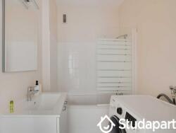 - Une salle de bain avec une baignoire, lavabo, porte serviettes et lave-linge.