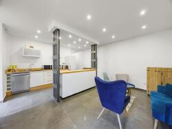 L'appartement se révèle ensuite dans sa pleine dimension. À l'arrière, tourné vers la cour intérieure et à l'abri des regards, s'ouvre un vaste salon-séjour d'environ 34m². La cuisine, élégamment intégrée et entièrement équipée, accompagne l'espace dans une atmosphère conviviale.
