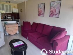? Une pièce à vivre avec un canapé convertible 2 places, deux fauteuils, un téléviseur et un coin cuisine équipé (plaque induction 2 feux, four électrique, four micro-ondes, frigidaire avec compartiment congélation, lave-vaisselle).