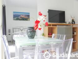- un salon avec un canapé, une table basse, une table de salle à manger pour 4 personnes, une TV, un meuble de rangement et internet/wifi,