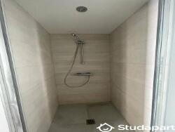 Une salle de bain avec douche et machine laver.