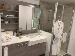 - Une cuisine équipée avec plaque à induction, réfrigérateur, hotte, micro-ondes et le nécessaire de vaisselle.