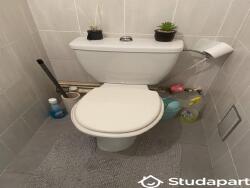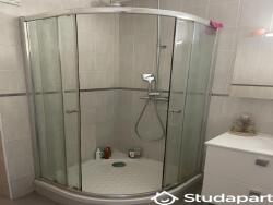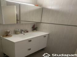 La salle de bain est équipée d'une cabine de douche et d'un meuble vasque. Le WC est séparé de la salle d'eau.