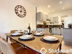 Cuisine ouverte équipée : lave-vaisselle, micro-ondes, bouilloire, grille-pain, four, cafetière expresso, ustensiles
