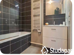 - Une salle de bain avec baignoire, wc et des espaces de rangement
